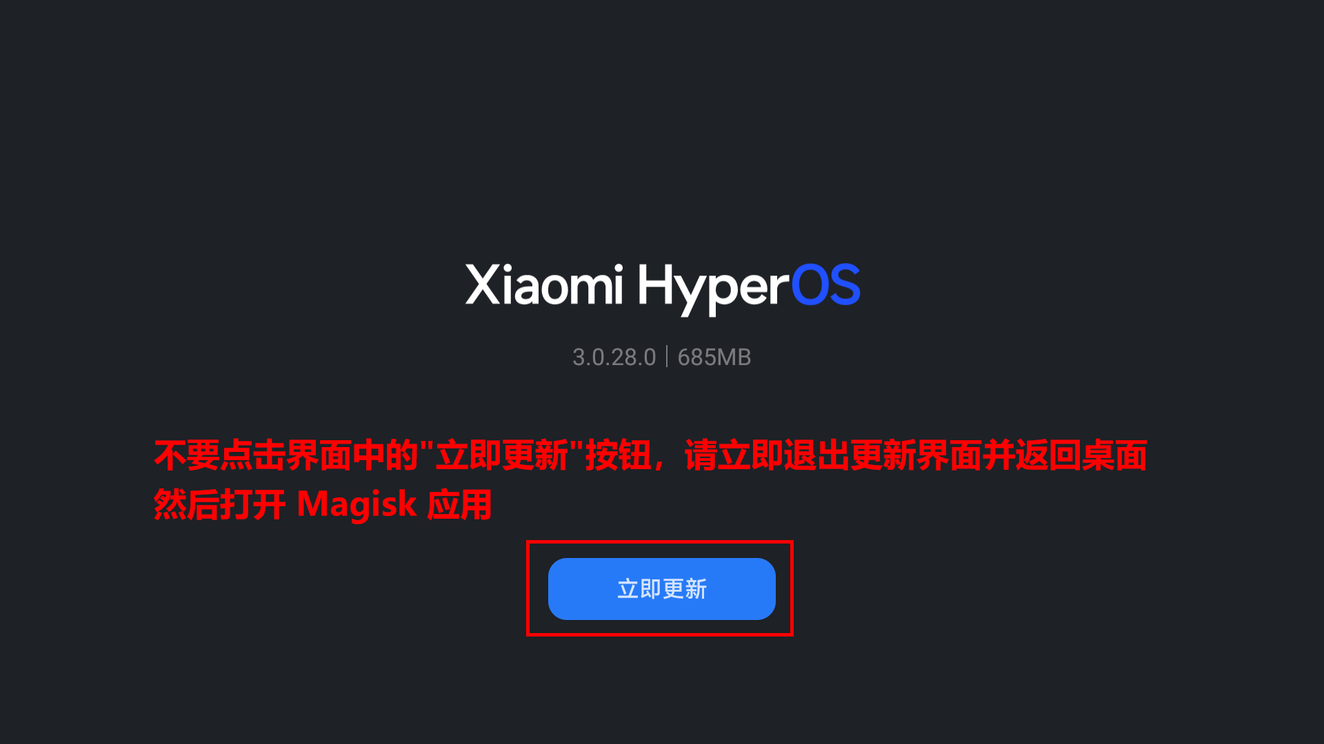 下载完成后不要点击界面中的"立即更新"按钮,请立即退出更新界面并返回桌面,然后打开 Magisk 应用