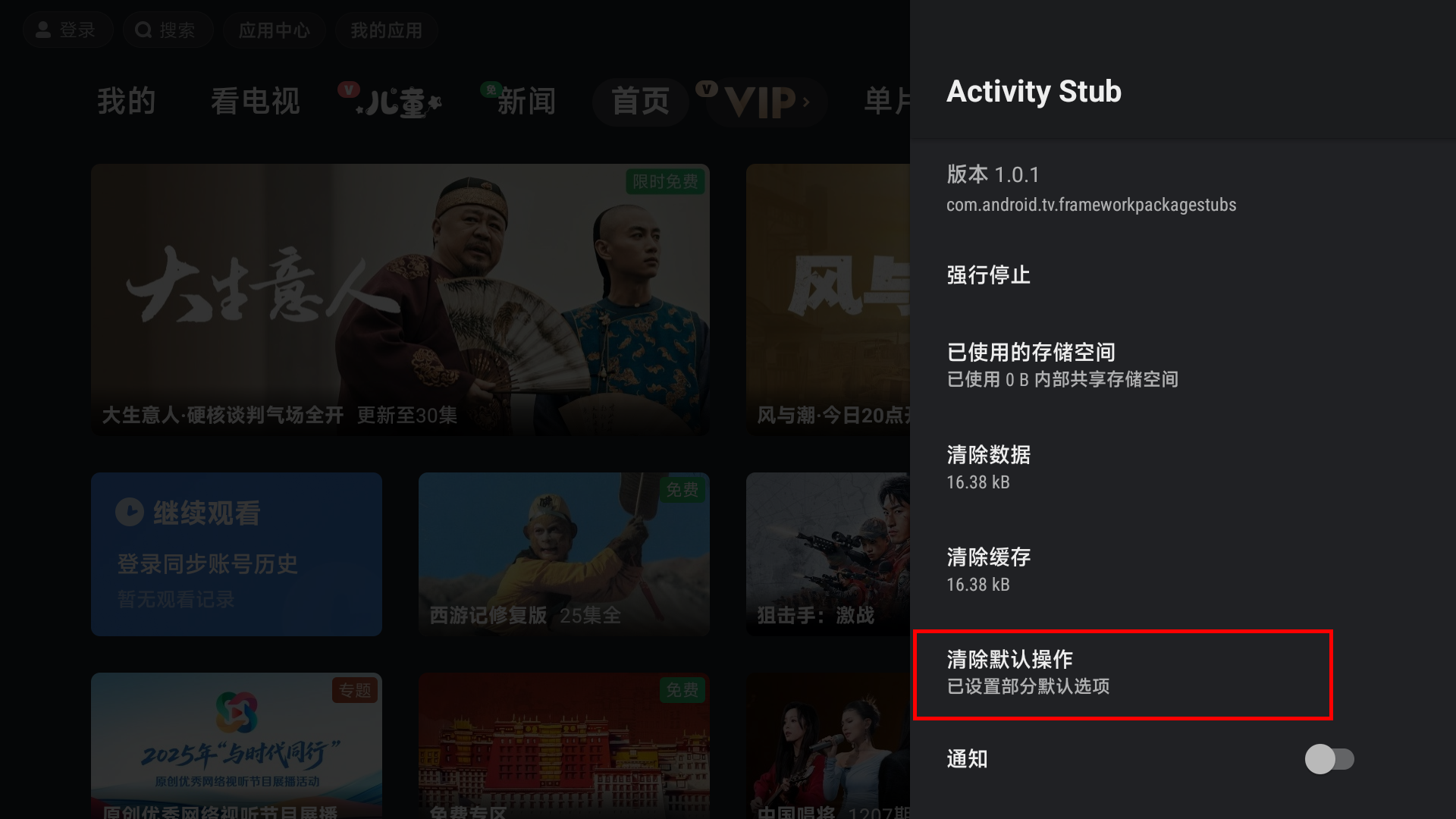 adb shell am start -a android.settings.APPLICATION_DETAILS_SETTINGS -d package:com.android.tv.frameworkpackagestubs应用信息页面打开后,请点击 清除默认操作 选项